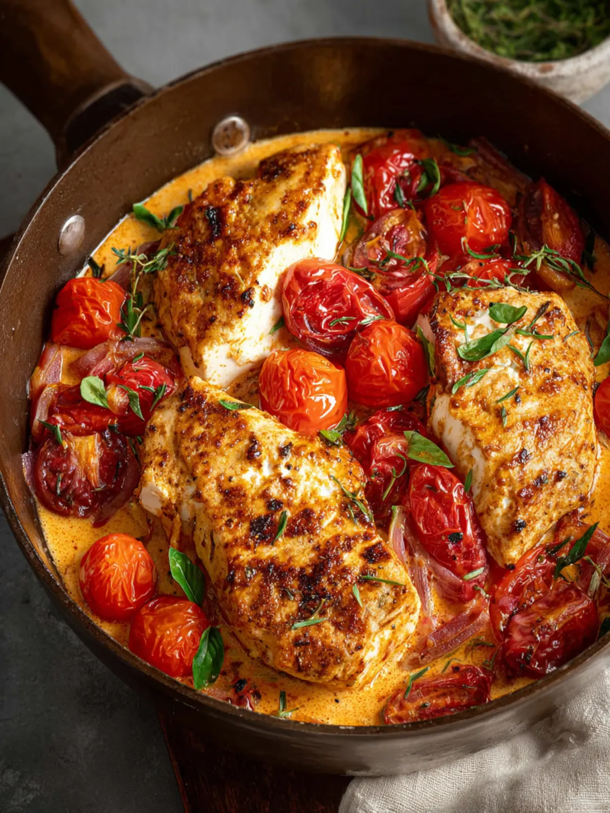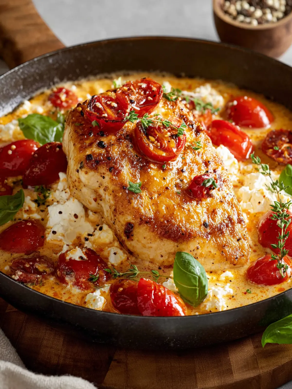 - Return the chicken breasts to the pan, toss to coat in the tomato-feta mixture, and top with fresh basil to serve.
