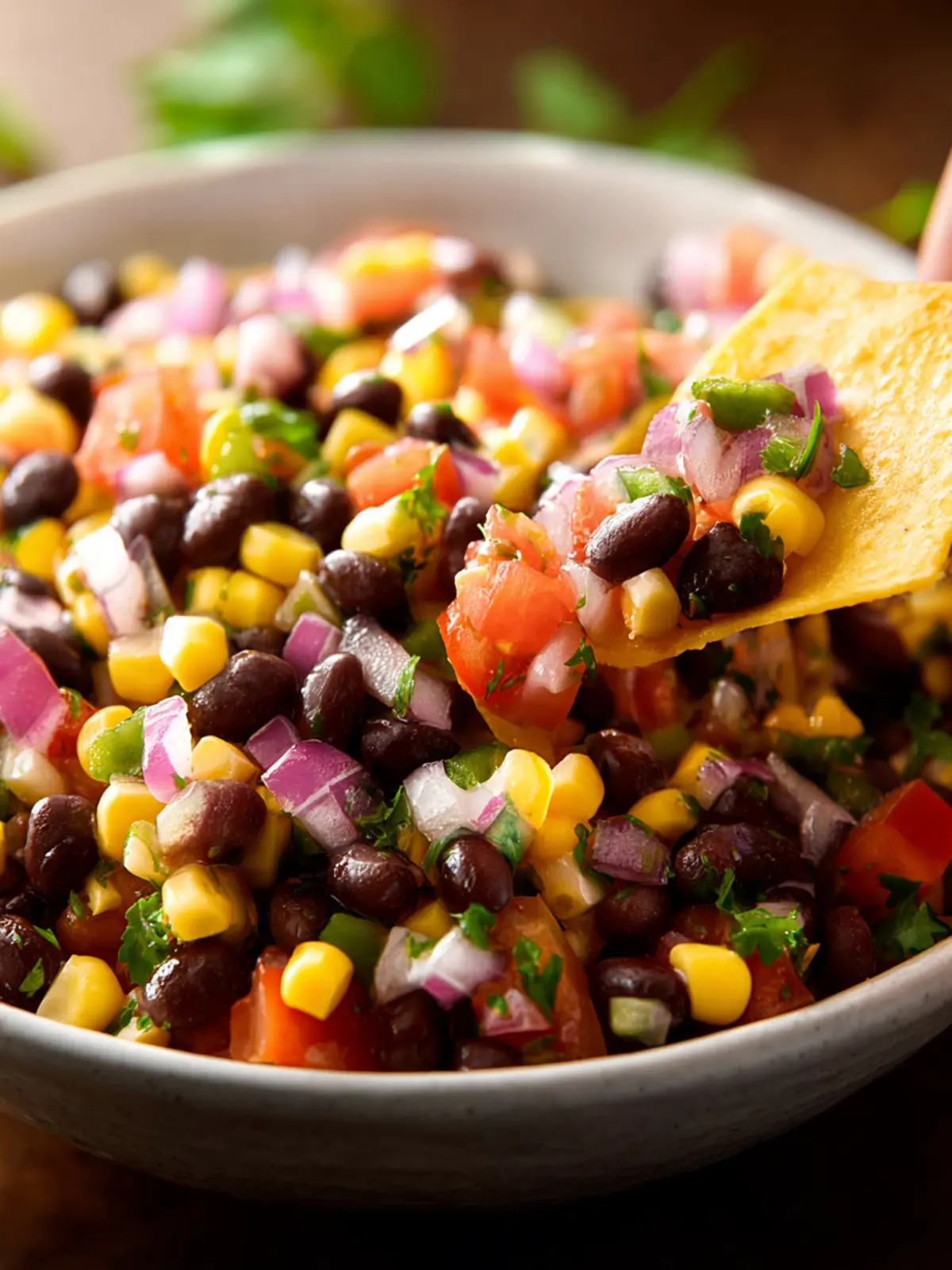 This fresh corn salsa is a delicious blend of roasted corn, black beans, and fresh vegetables, perfect for serving with tortilla chips.
