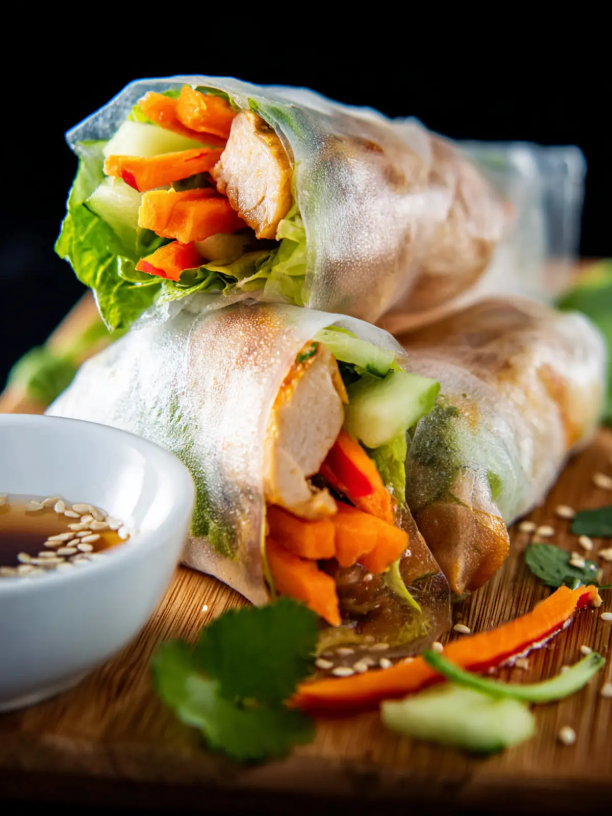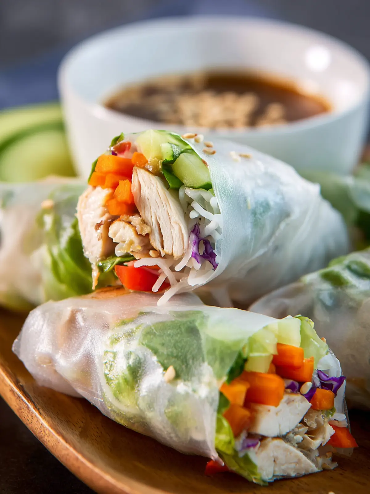 These fresh spring rolls filled with chicken, veggies, and served with a delightful teriyaki dipping sauce are perfect for a light meal or appetizer.