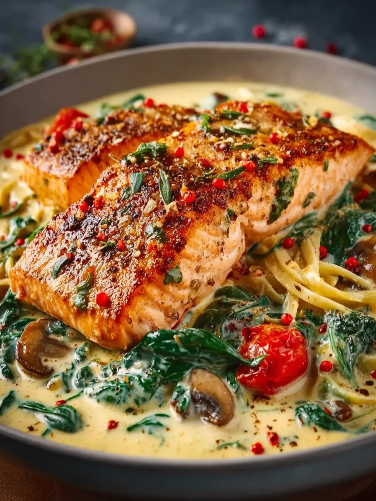 Health Meets Indulgence: Salmon is renowned for its health benefits, being rich in Omega-3 fatty acids. With the addition of spinach and sun-dried tomatoes, this dish offers a delightful balance of nutrition and rich, creamy flavor that keeps you feeling satisfied without compromising on taste.