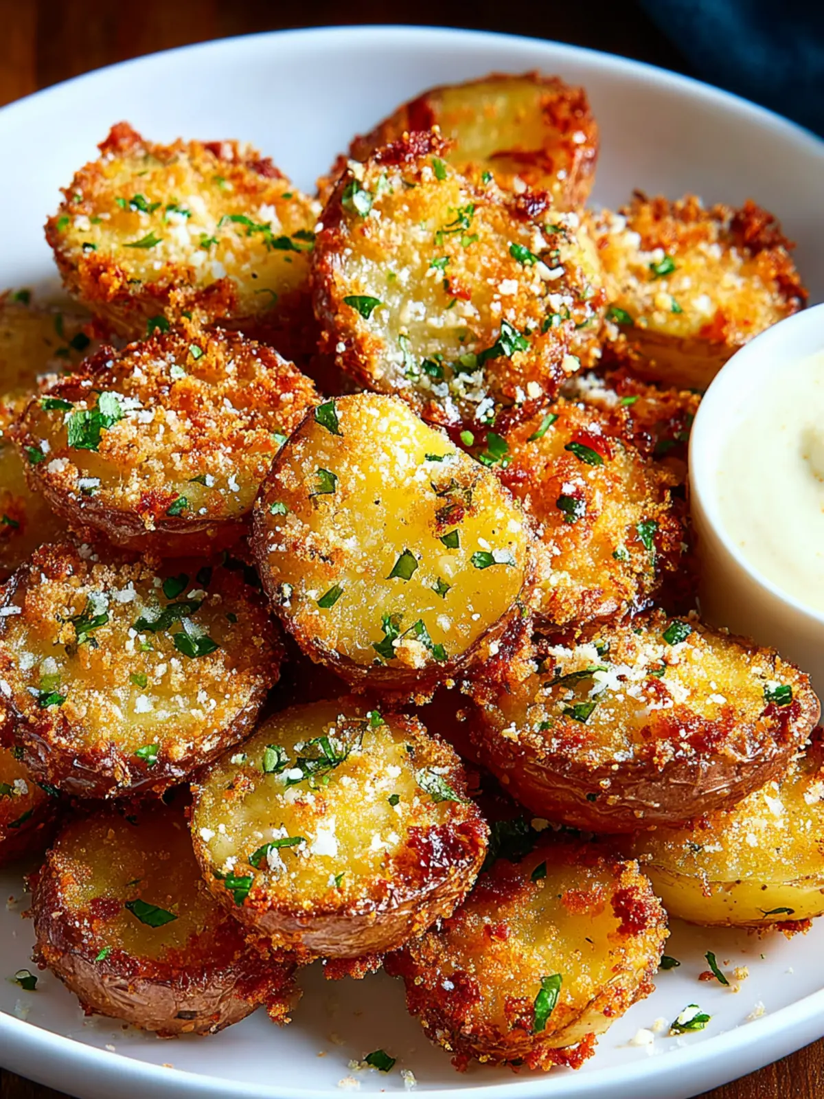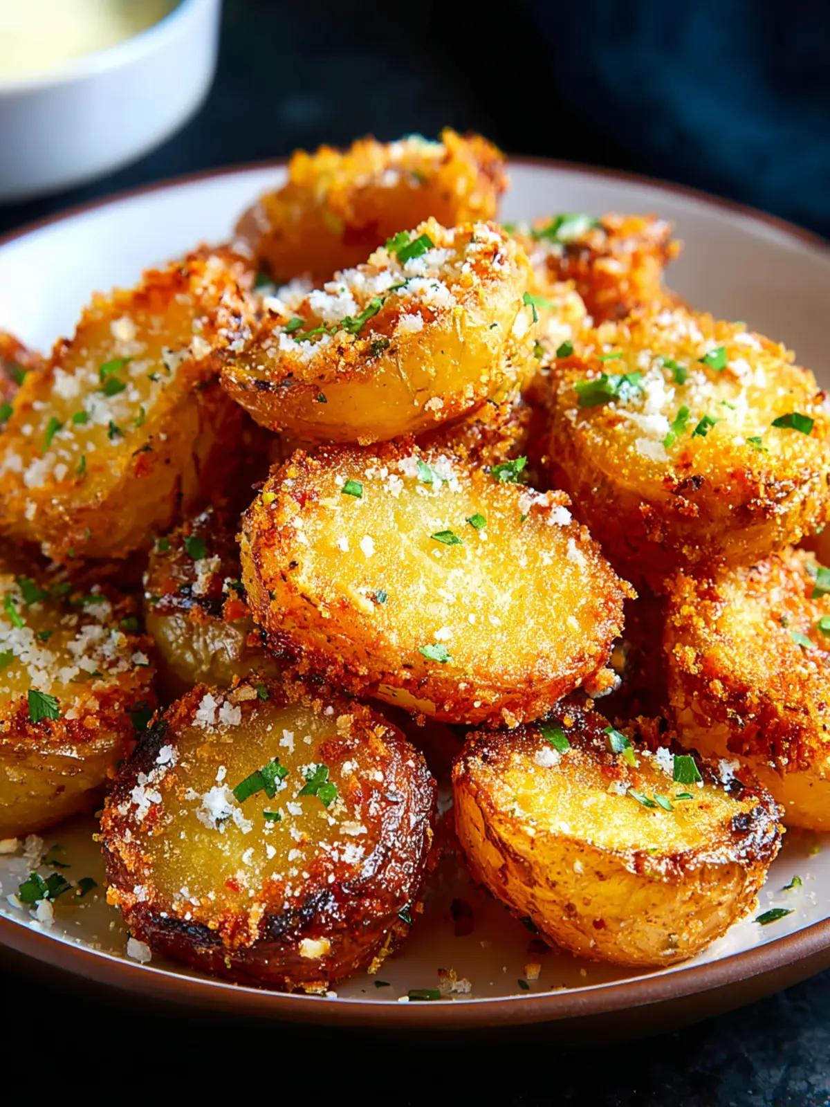Delicious crispy baby potatoes coated with Parmesan cheese and herbs, perfect as a side dish.