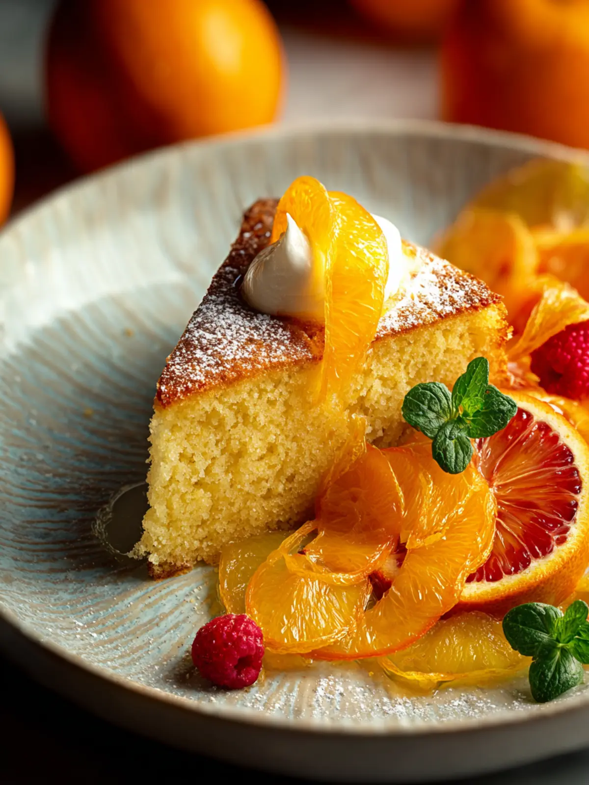 Fresh Berries: A handful of fresh berries such as raspberries, strawberries, or blueberries adds a burst of flavor and color. Their tartness perfectly complements the sweetness of the orange cake.