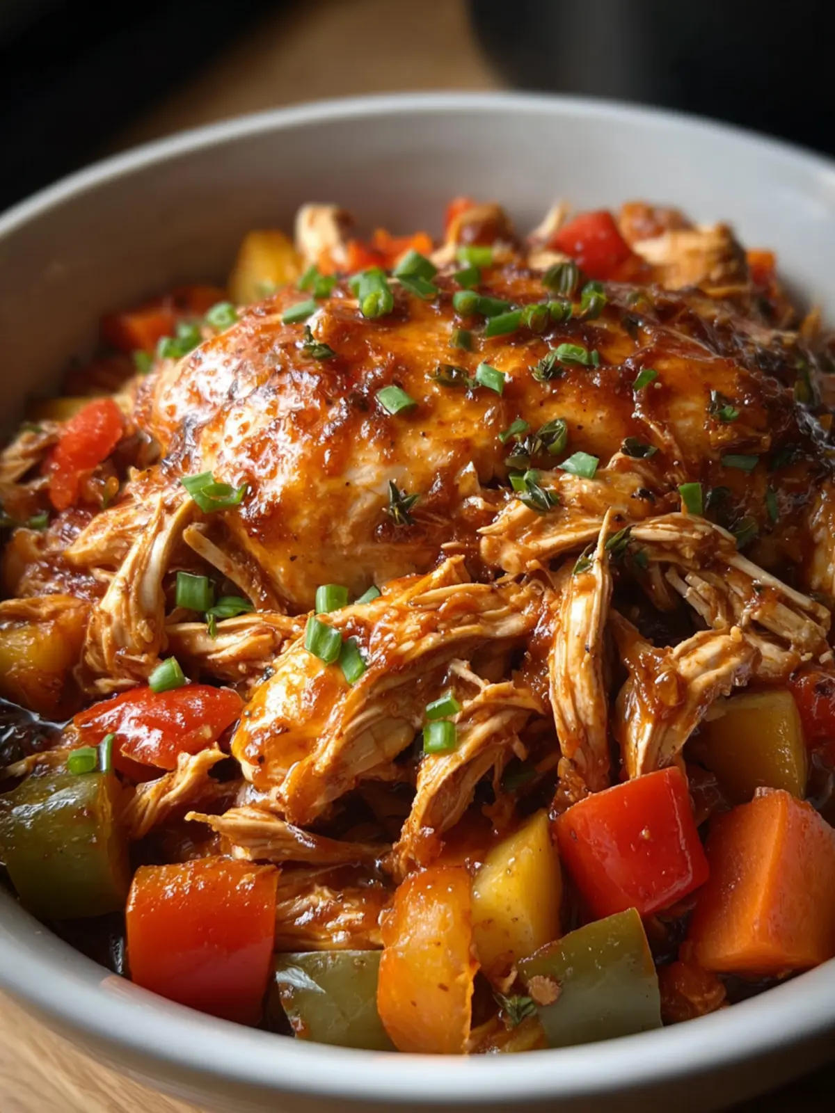 Delicious and tender chicken thighs cooked in a savory barbecue sauce with vegetables, perfect for a hearty meal.