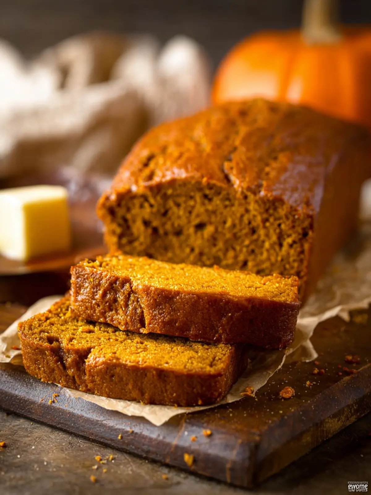 Deliciously moist pumpkin bread spiced with cinnamon and pumpkin pie spice.