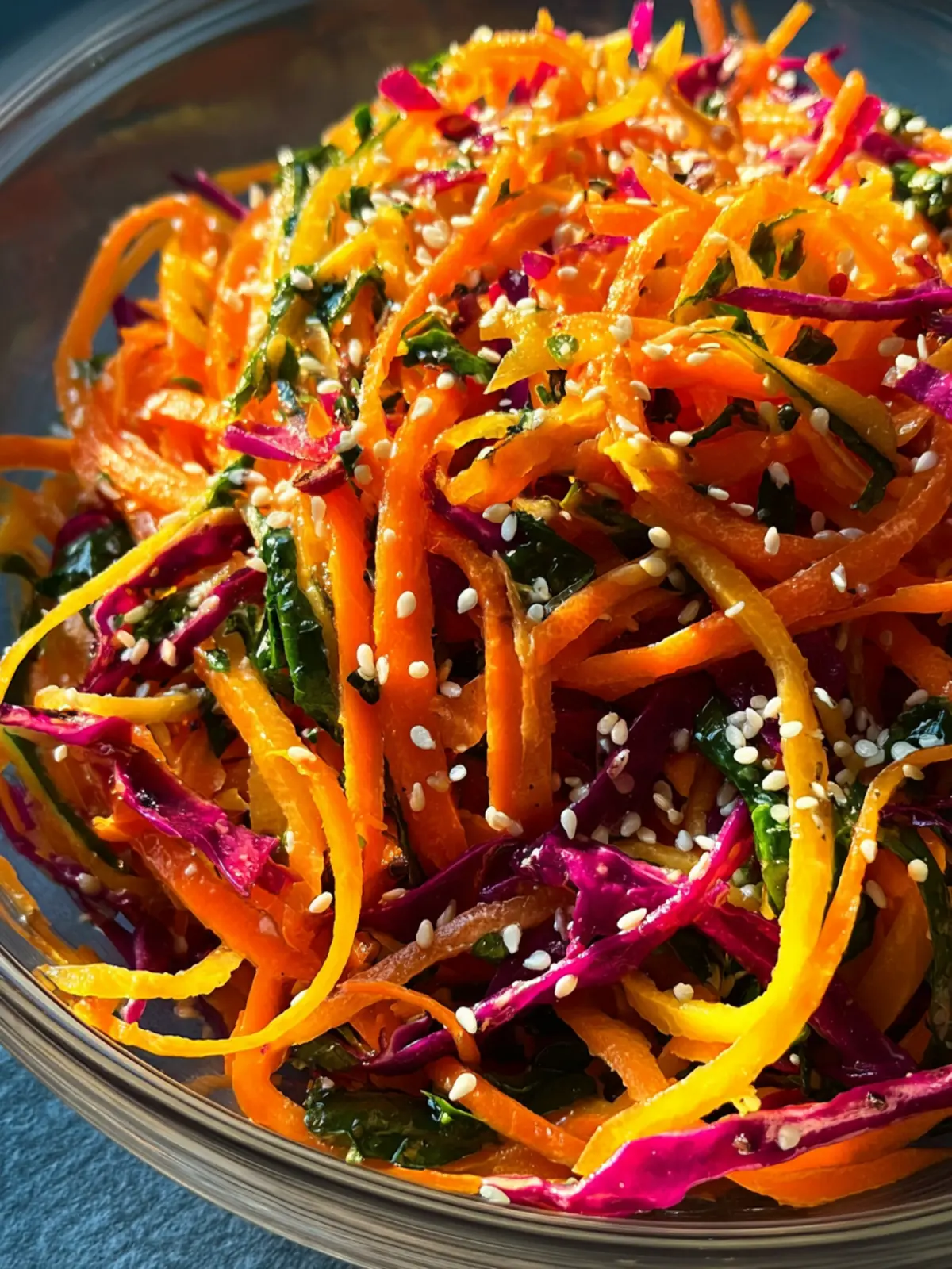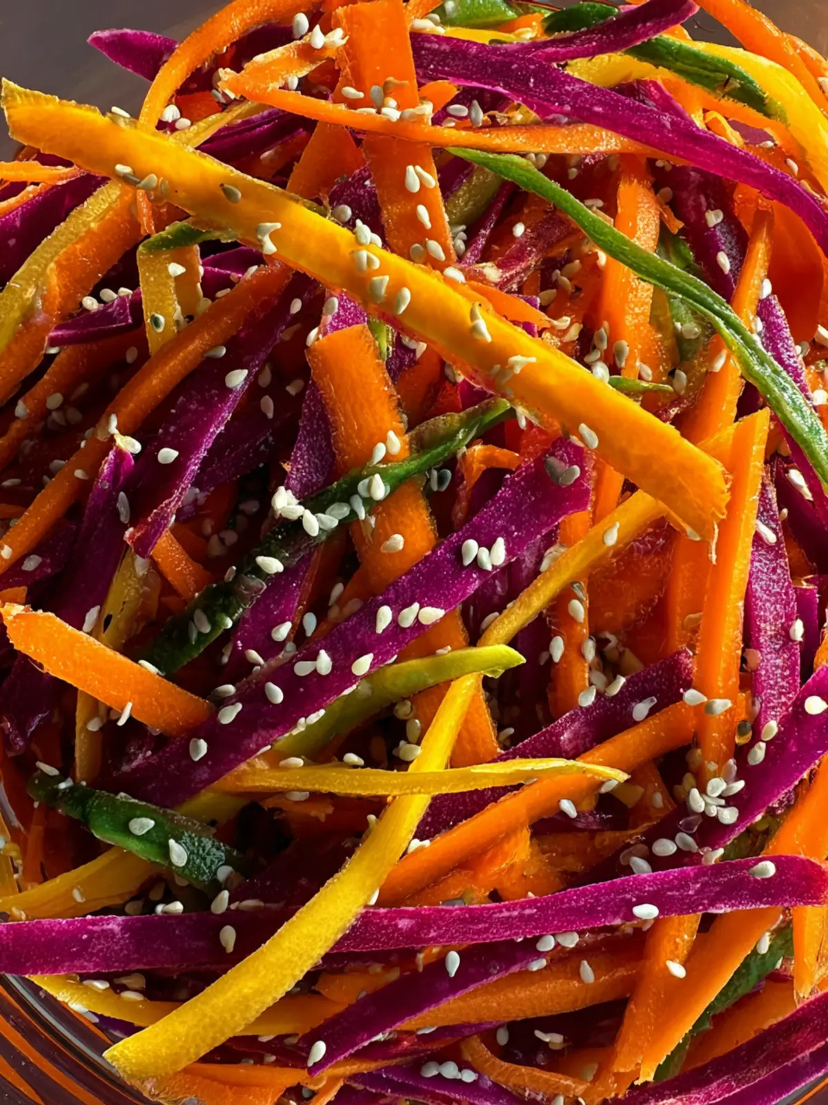 In just 15 minutes, you’re ready to serve a rainbow carrot sesame salad that’s not only healthy but also visually stunning. Enjoy the compliments as you share this quick, refreshing dish!