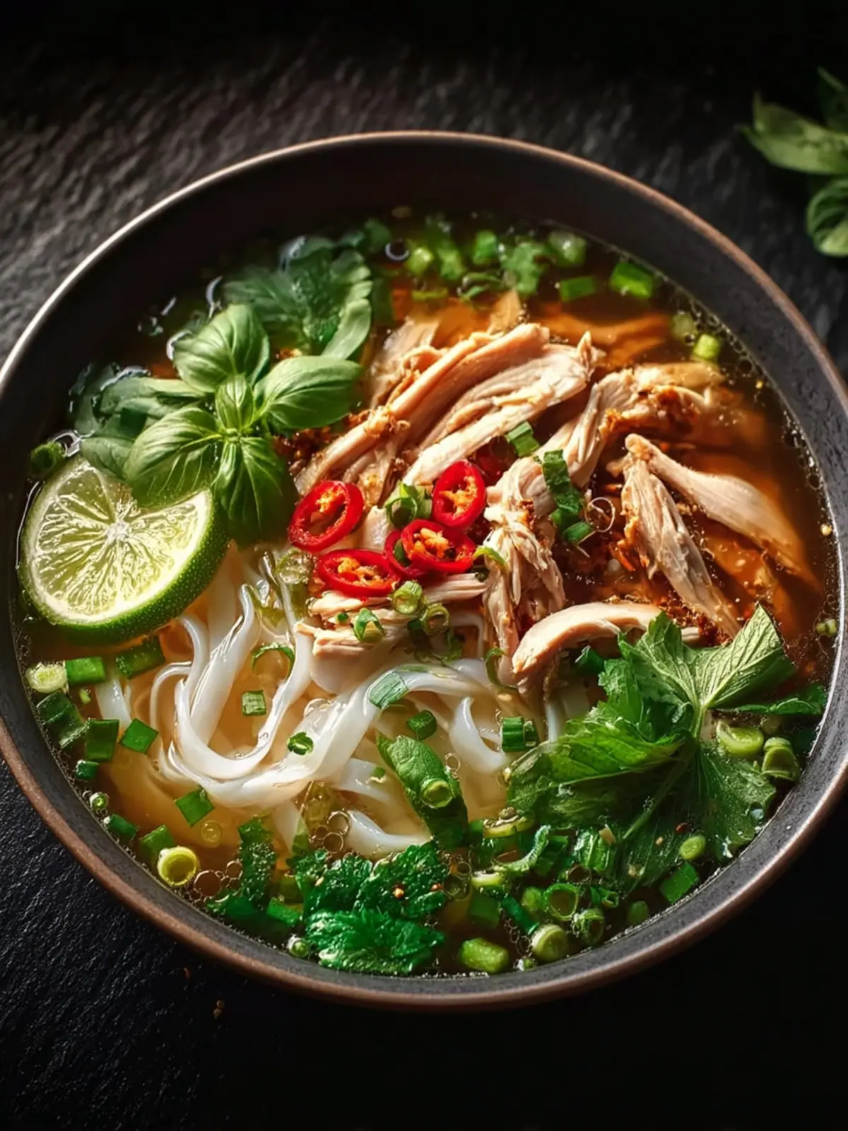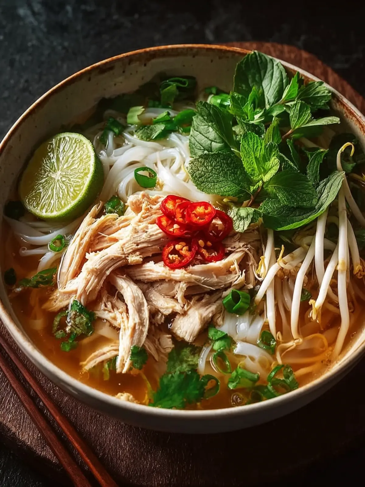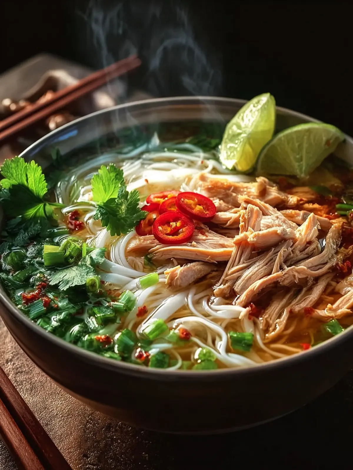 - Assemble bowls with noodles and shredded chicken. Ladle hot broth over, then top with herbs, green onions, lime, and optional chili sauce.