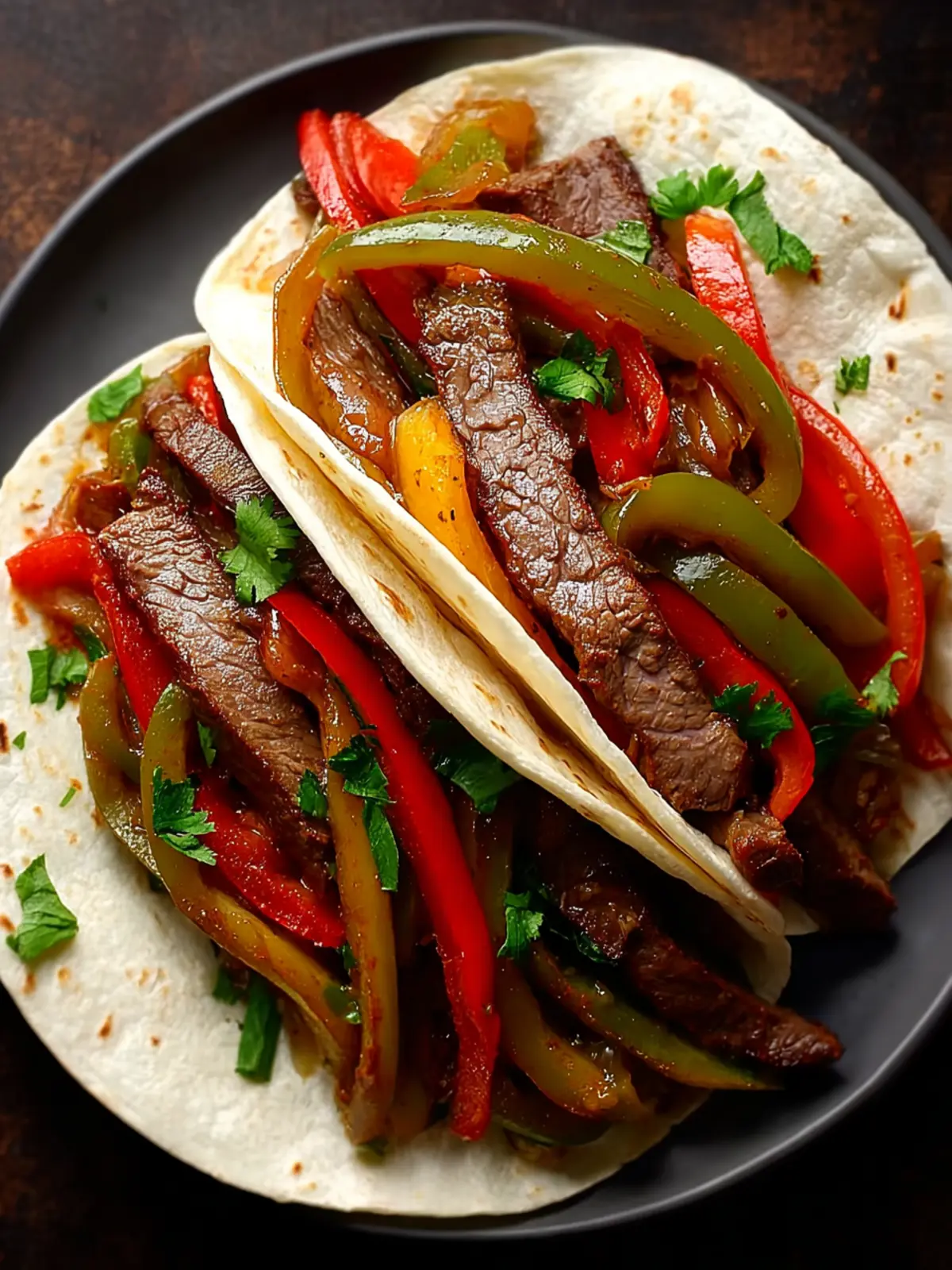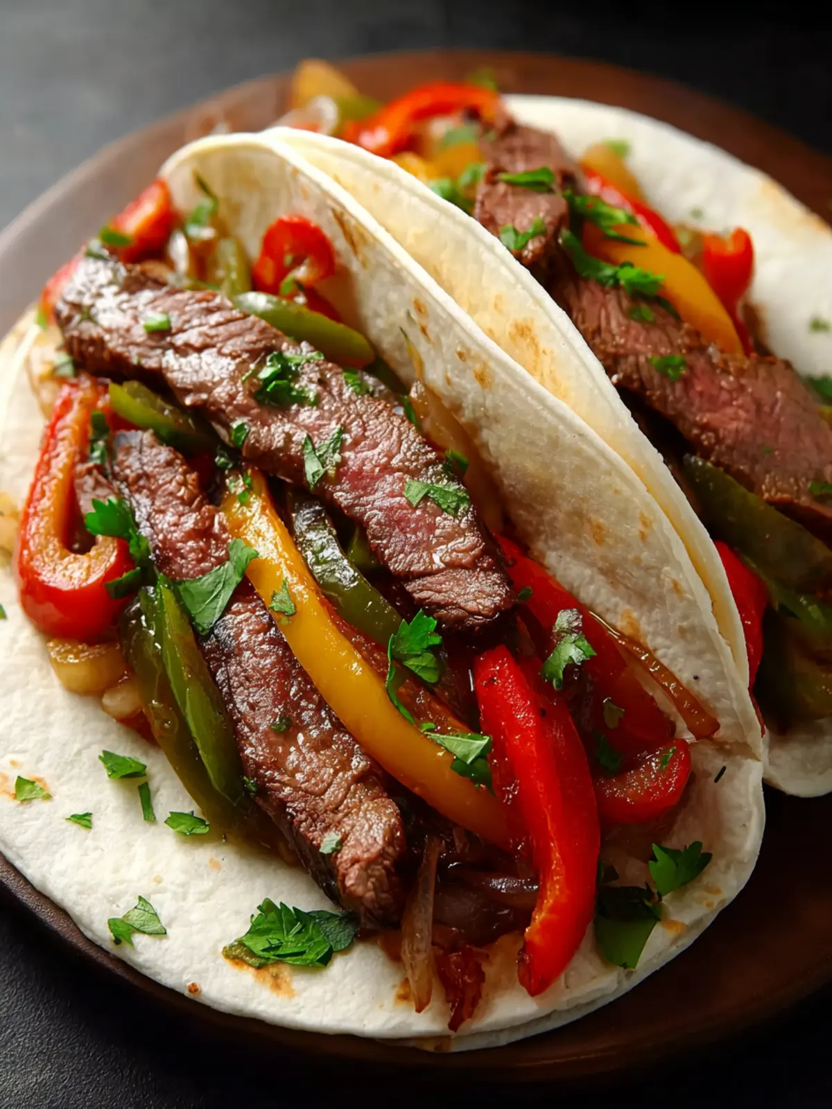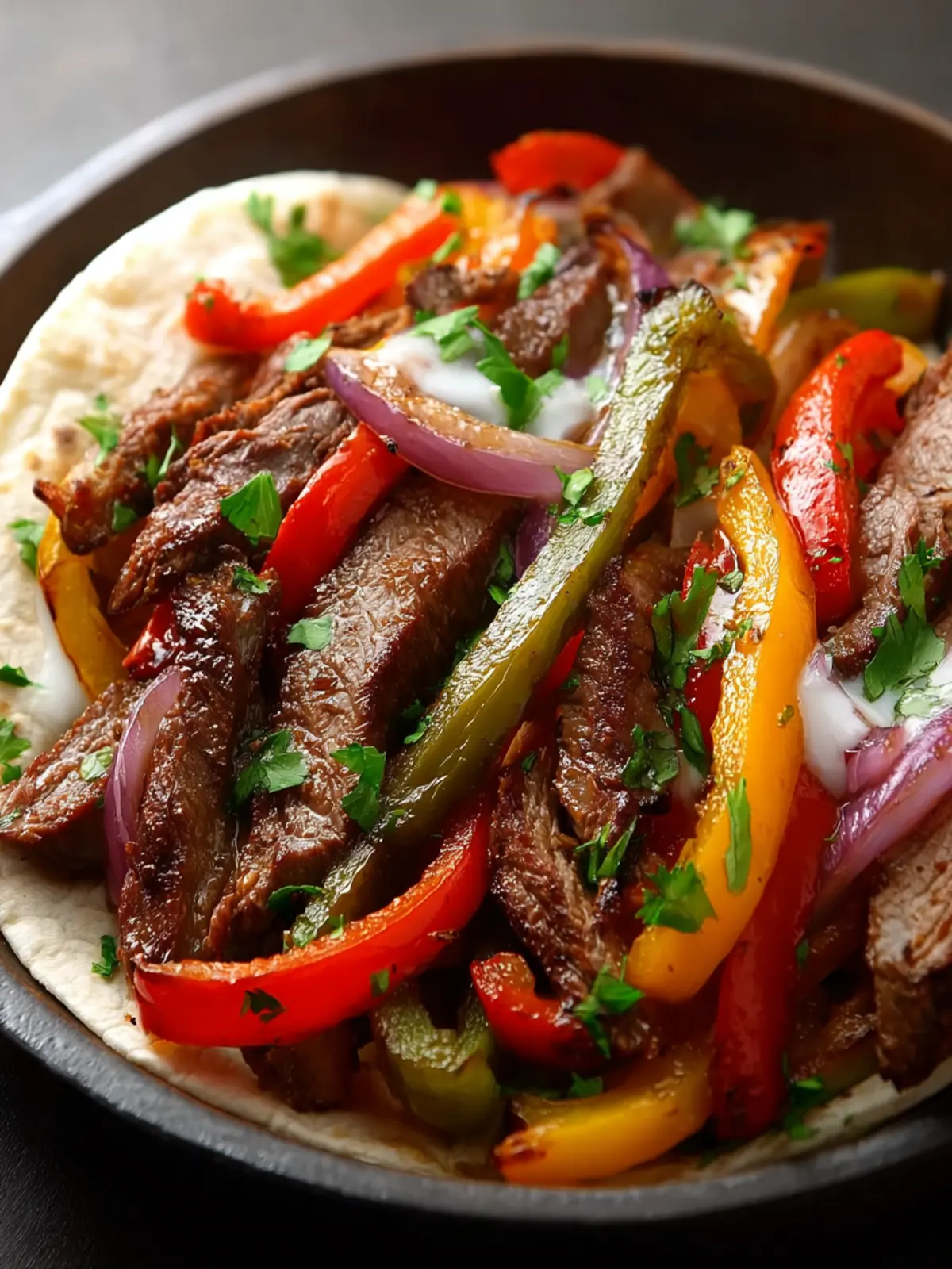 Delicious steak fajitas with colorful bell peppers, served with warm tortillas.