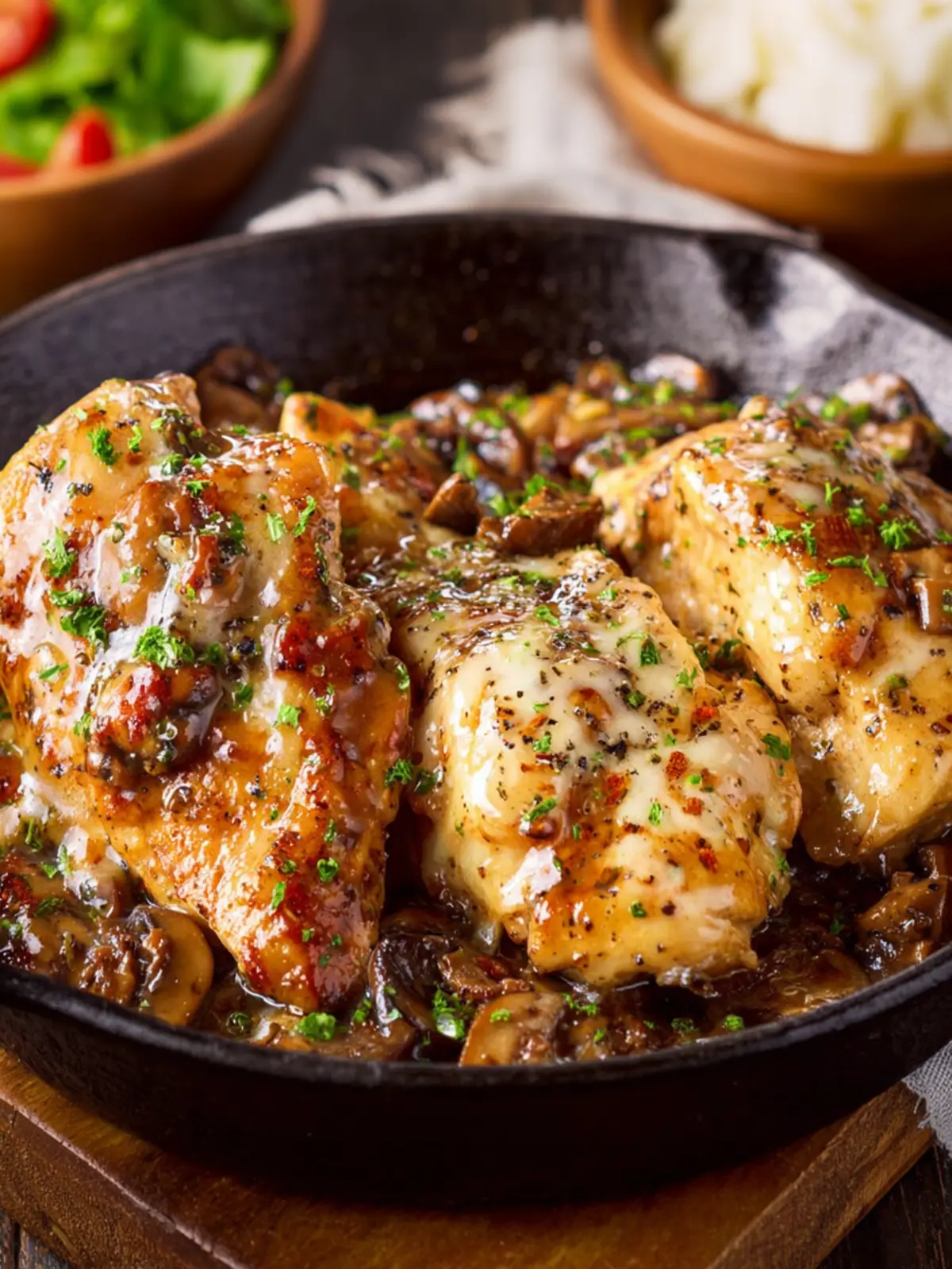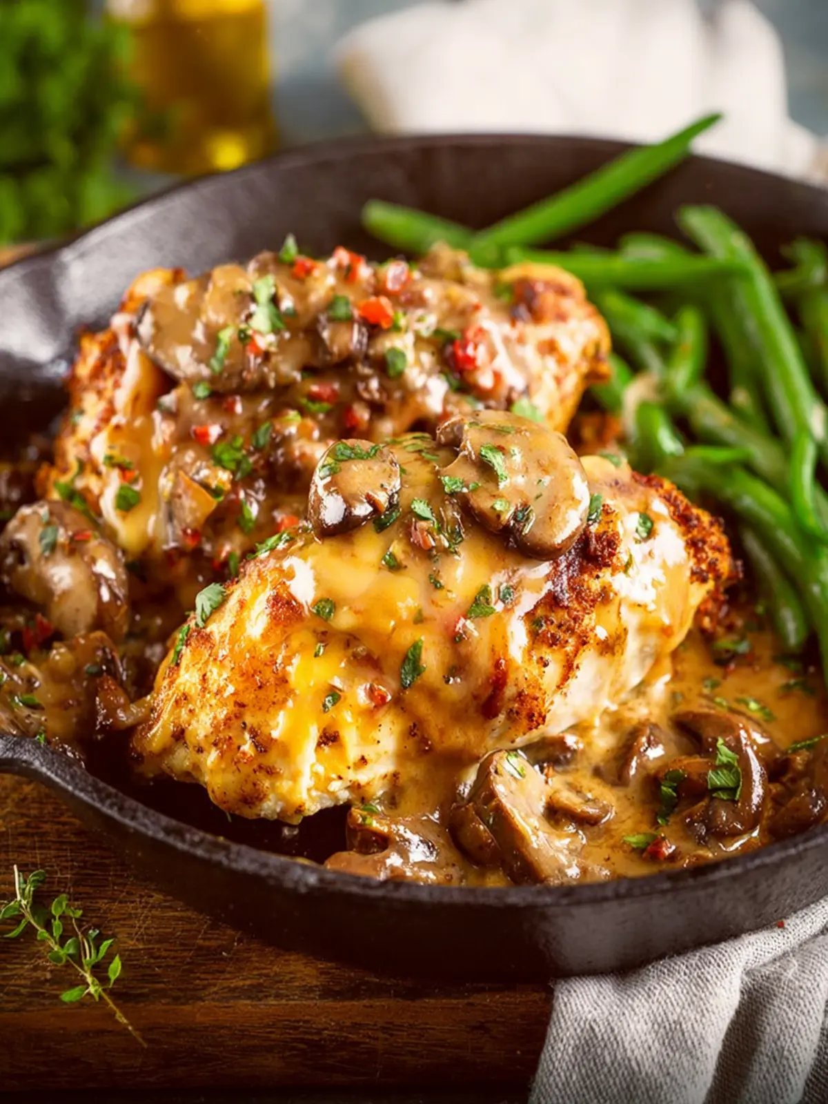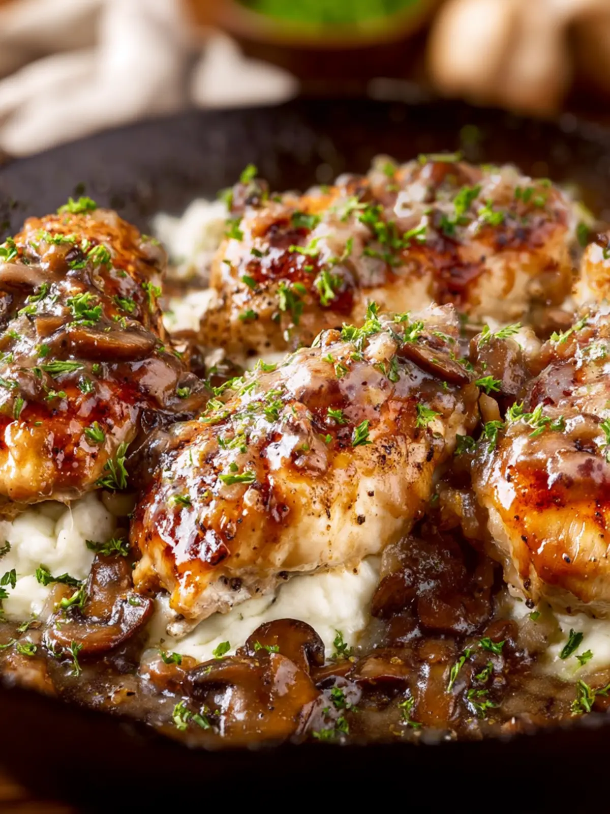 - Spoon some more of the sauce, mushrooms, and onions over the chicken.